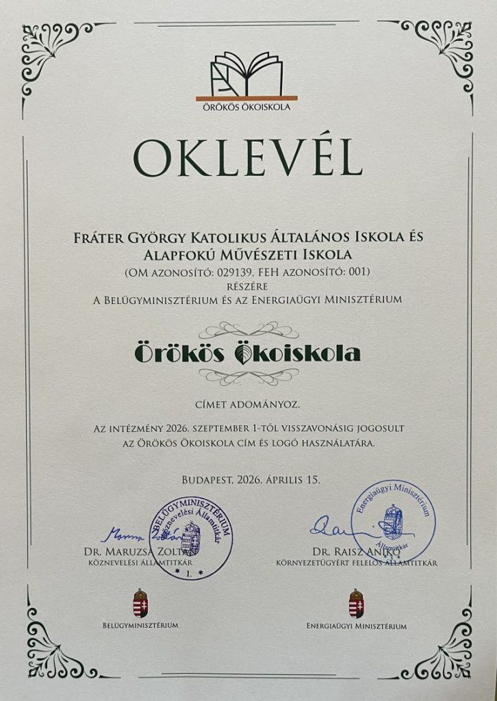 A Fráter György Katolikus Általános Iskola és Alapfokú Művészeti Iskola elnyerte az Örökös Ökoiskola címet. Az elismerést a Belügyminisztérium és az Energiaügyi Minisztérium adományozta az intézmény számára.