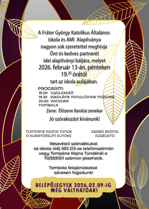 Alapítványi bál Intézményünk Alapítványa nagyon sok szeretettel meghívja Önt és kedves partnerét az ide alapítványi báljára! 2026-02-06 Nagy Gábor