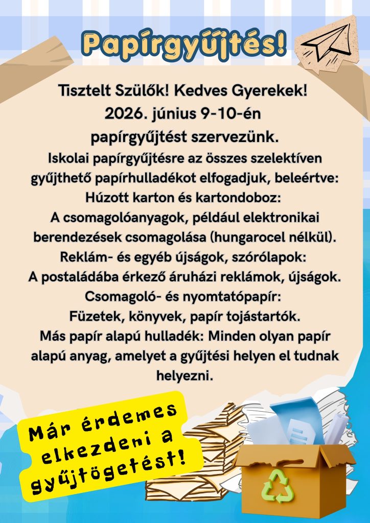 Papírgyűjtés Tisztelt Szülők! Kedves Gyerekek! 2026. június 9-10-én papírgyűjtést szervezünk. 2026-04-14 Nagy Gábor